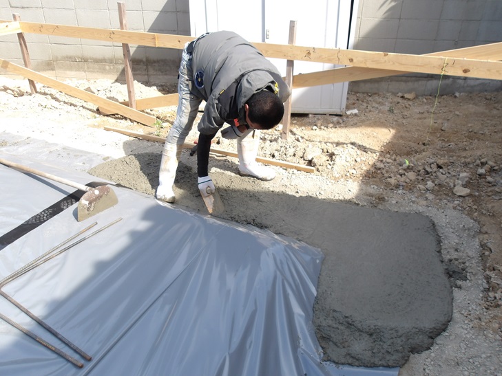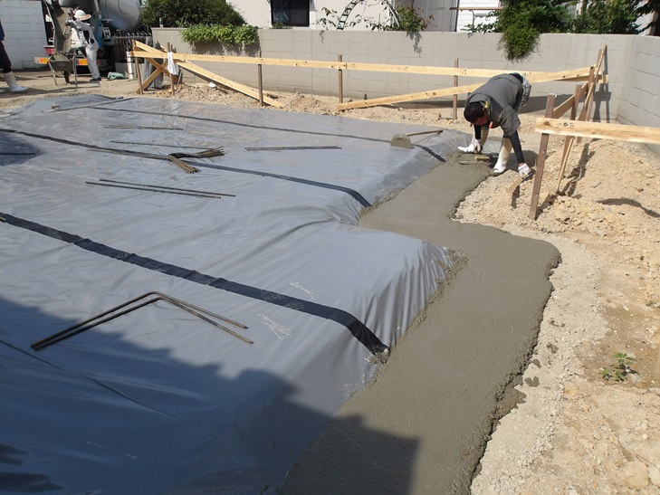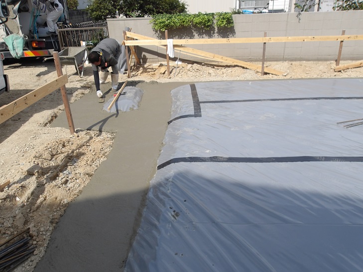 防蟻防水シート張り後、基礎外周部分に捨てコンクリートを施工します。