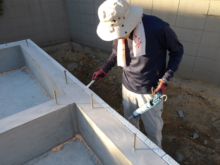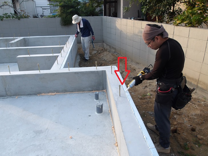 基礎の断熱材を整形した後、断熱材と基礎コンクリートの取り合い部分に防蟻剤入りのコーキングを施工します。