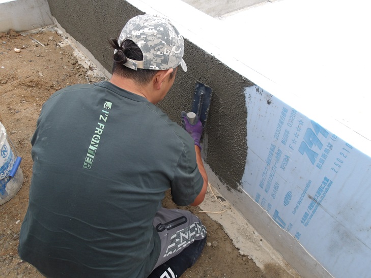 基礎断熱材の上に断熱材を雨風や紫外線から守る為の保護モルタル塗り工事です。