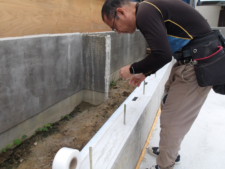 左官さんが基礎外側でモルタル塗りをしている時、大工さんが基礎コンクリートん天端に土台を取り付ける位置の墨付けです。