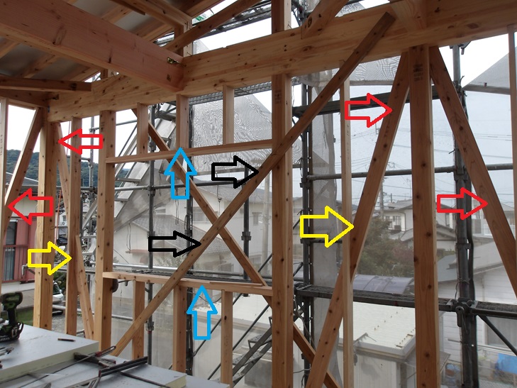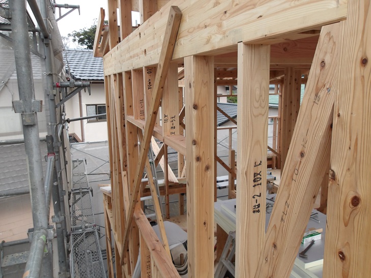 同じように殺い矢印の斜めの柱が見えますが、これは上棟時に取り付けた仮筋交いです。