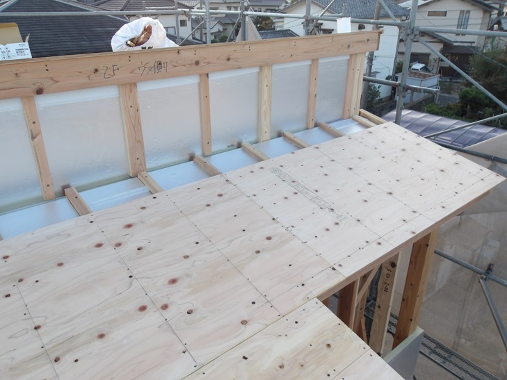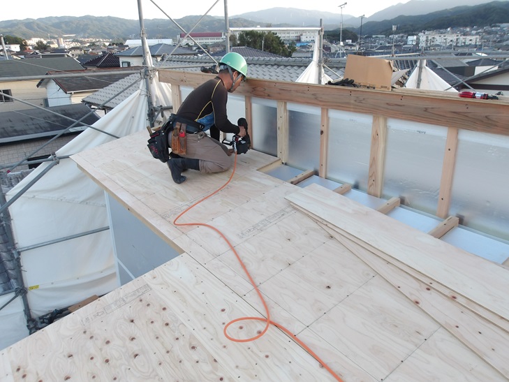 屋根の断熱材工事が終わると屋根仕上げ材を施工するための野地板を張ります。