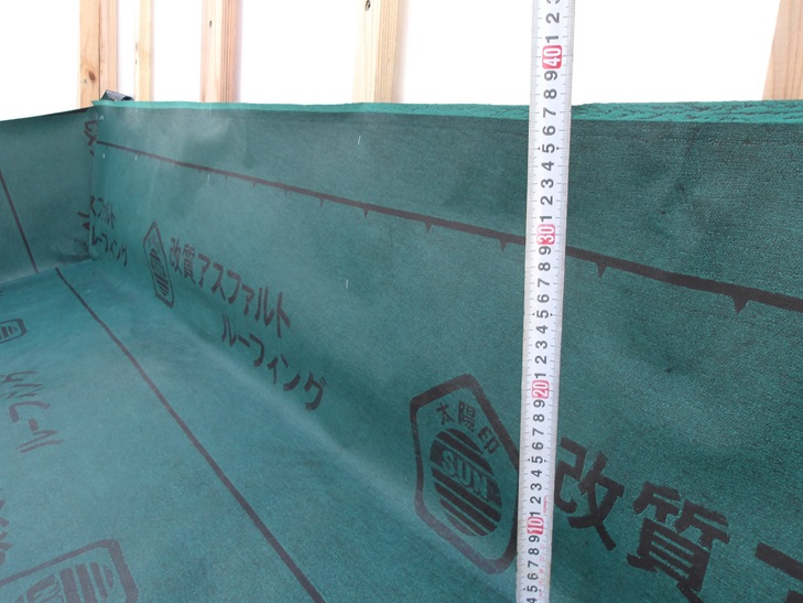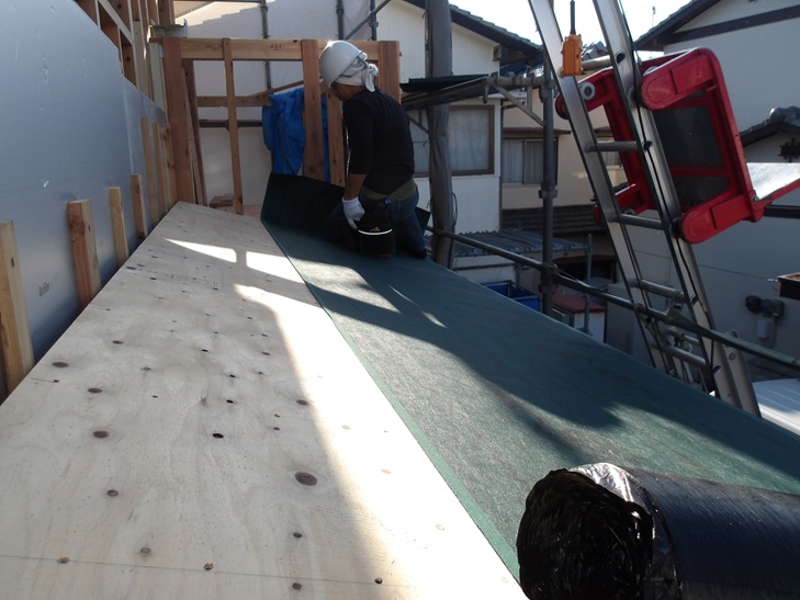 先ず、野地板の上に専用の防水ルーフィングを張ります。