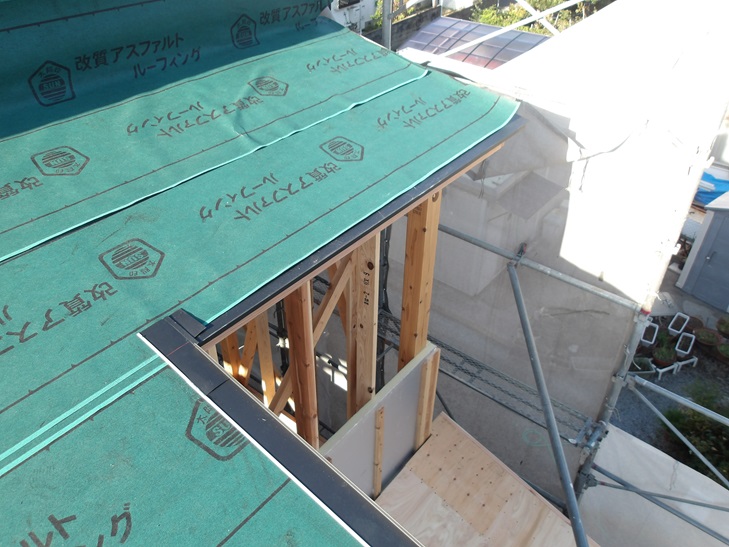 下屋(げや、1階の屋根)の防水ルーフィングは、壁の立ち上がりを30cm以上施工します。