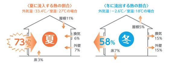 夏は外の熱の73%が窓から侵入し、冬は室内の温かさがまどから58%外に逃げます。