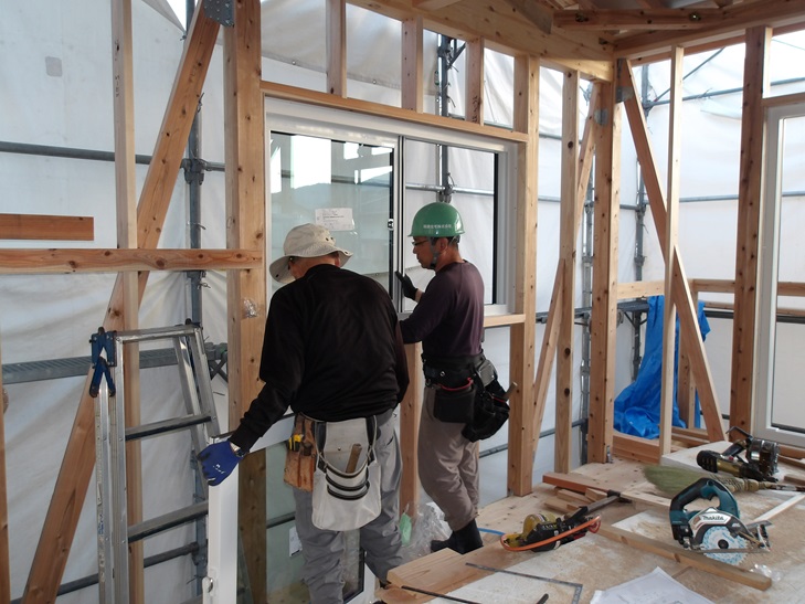 岩﨑棟梁と中川大工さんの二人で樹脂製窓の取り付けです。