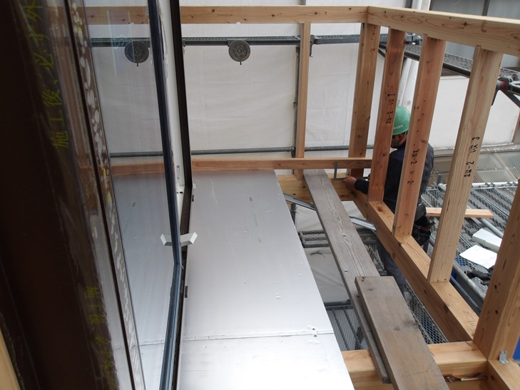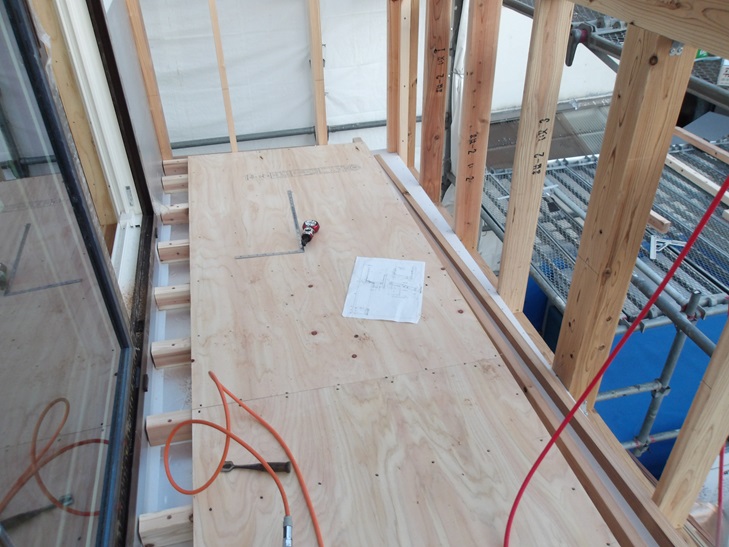 気密断熱テープを貼った後にバルコニーの床を支える垂木(たるき)を取り付けます。