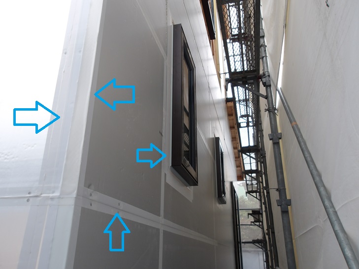 断熱材施工が終わった部分は、写真のように気密防水テープを貼ります。