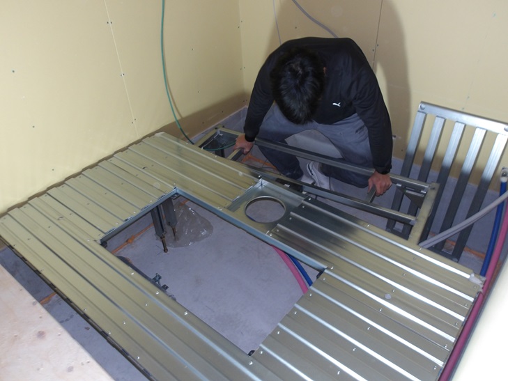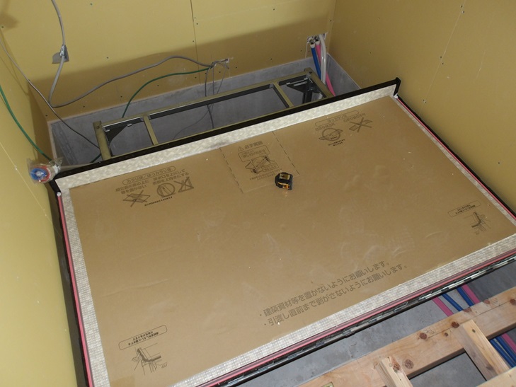 洗い場部分のほっからり床を設置して工事中のキズ汚れ防止養生をします。