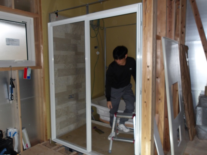 床と浴槽の設置が終わると壁とドアの取り付けです。