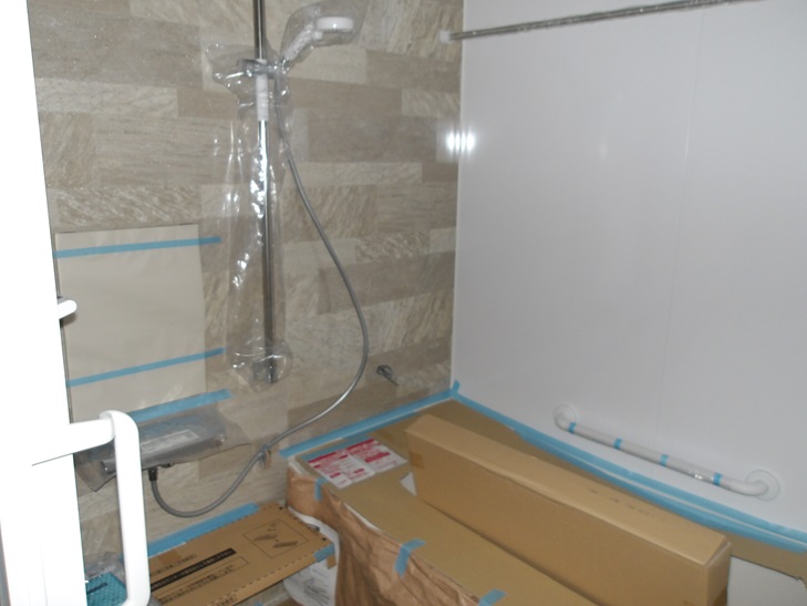 設置完了後は、床だけでなく、浴槽やカウンターもキズ汚れ防止の養生をします。