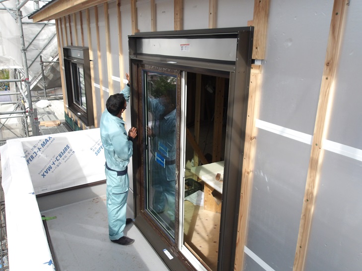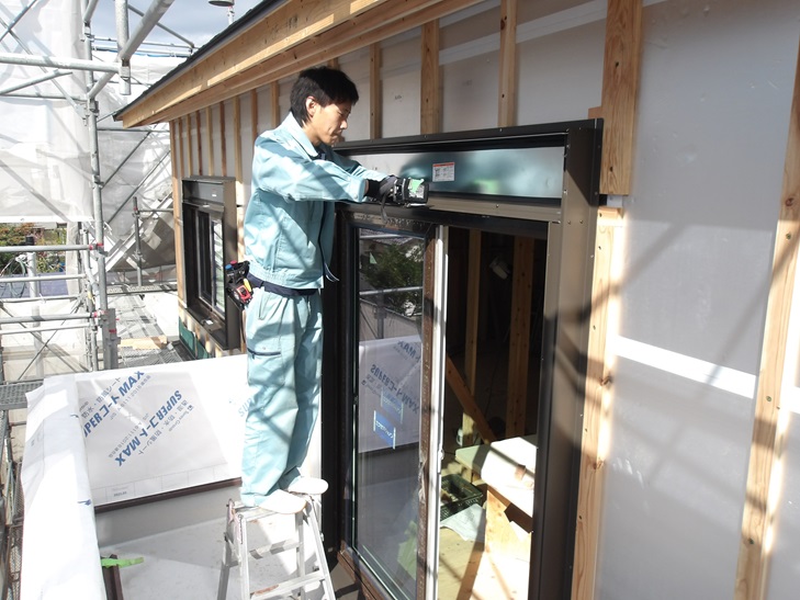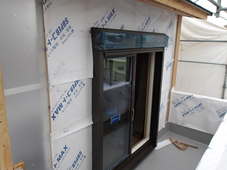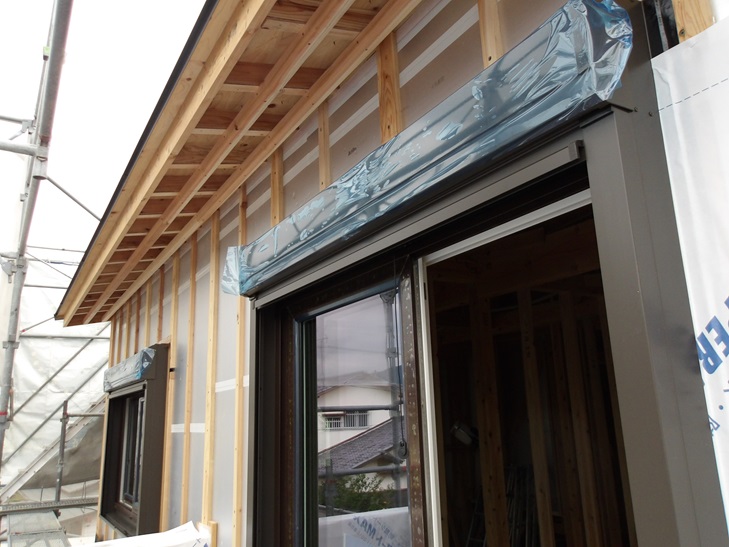 シャッター雨戸取り付け後は、シャッター周りに2次防水である透湿防水シートを張り、シャッター枠から雨が侵入しないようにします。