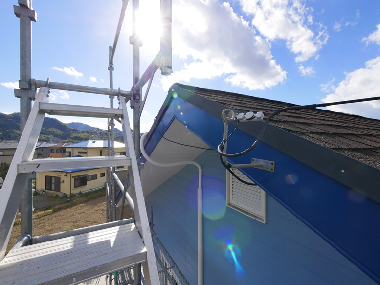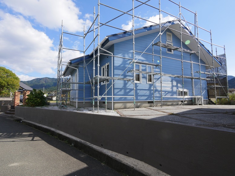 青空にめちゃめちゃ映えるブルーの外壁です。