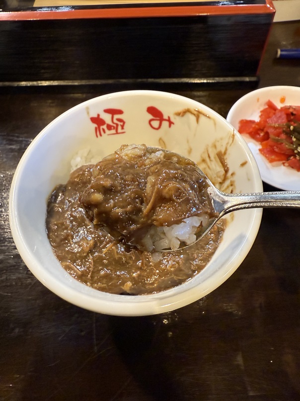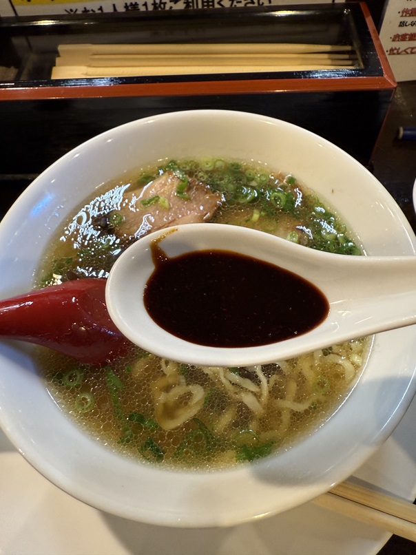 煮干の美味しくてちょい甘いスープにピリ辛の秘伝のたれを入れると、いい感じで味変しました。