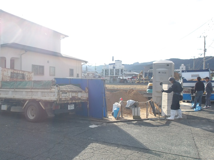 床掘りで出た土は、残土としてトラックで専用の場所に運び出します。