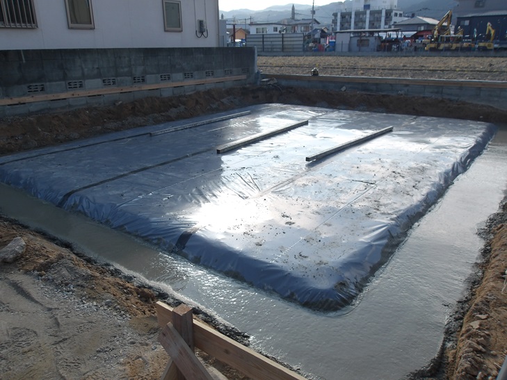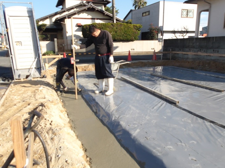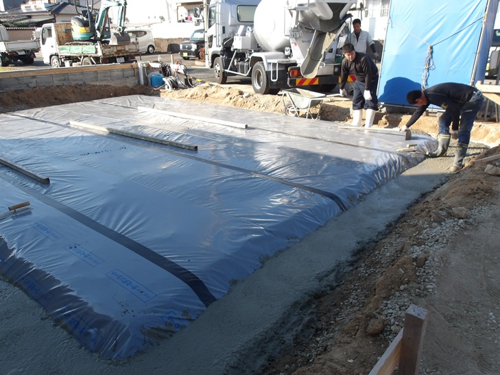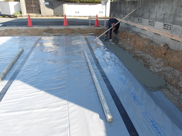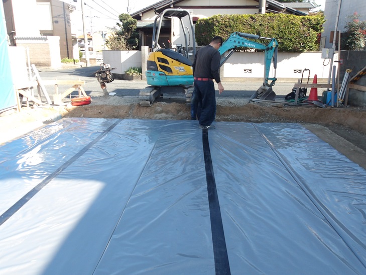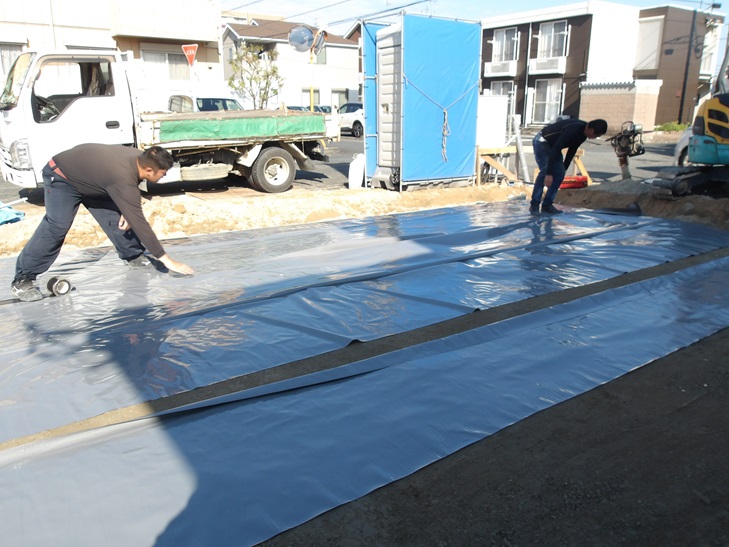 基礎工事 防水防蟻シート 捨てコンクリート打設 那珂川市つながる家 注文住宅 外断熱の家