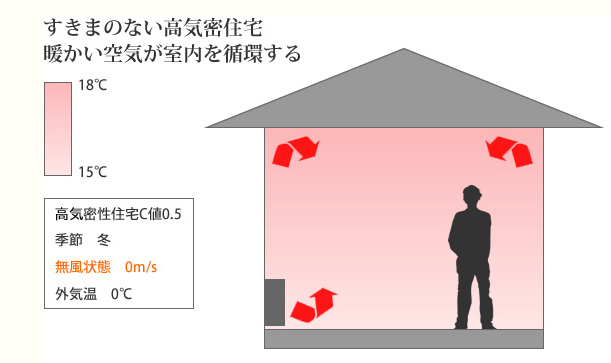 また、部屋の上下の温度差もなくまた家全体の温度差も非常に少ないヒートショックのない家にすることが出来るのです。
