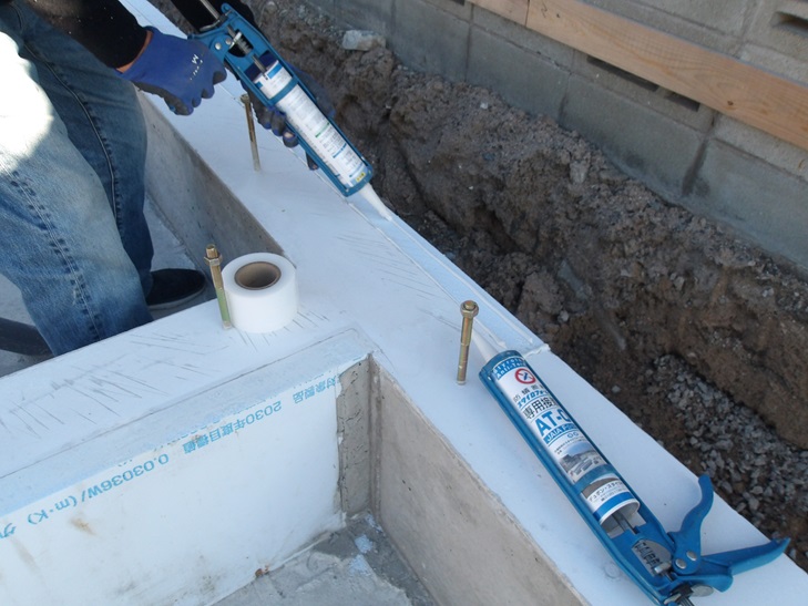 シロアリ対策の防蟻剤入り断熱材を採用し、断熱材とコンクリートの間に防蟻剤入りのコーキングを施工し万が一の隙間も出来ないようにします。