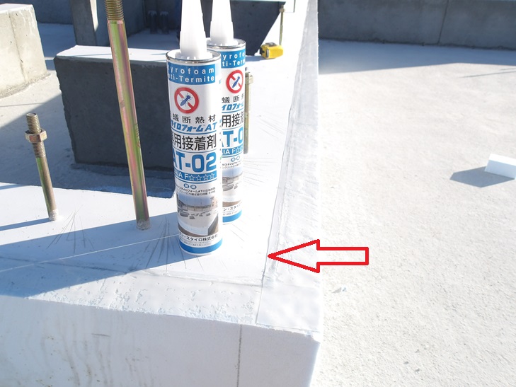赤い矢印部分に防蟻剤入りコーキング材を施工します。