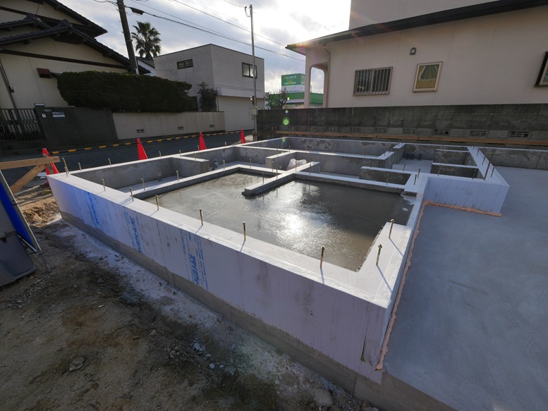 基礎コンクリートの外側に断熱材があるので外断熱の基礎です。