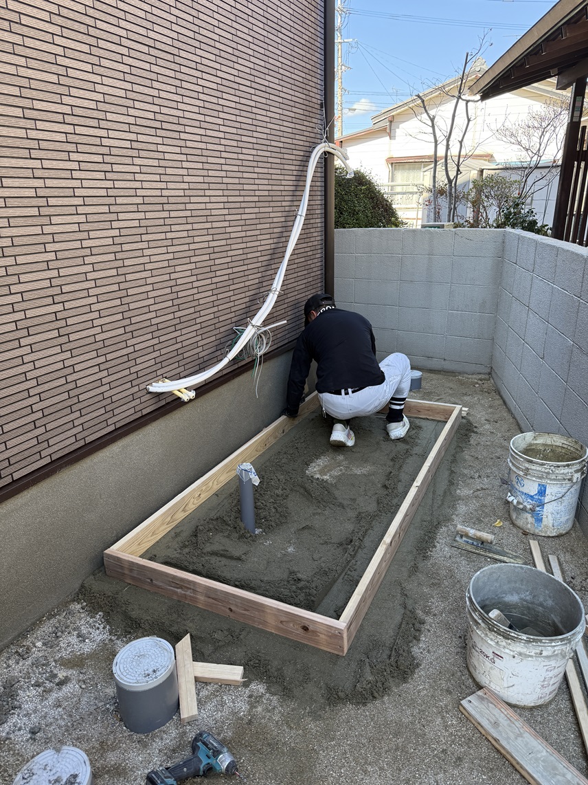 エコキュート(ヒートポンプ式電気給湯器)を設置するための架台を左官さんがモルタルで作ります。
