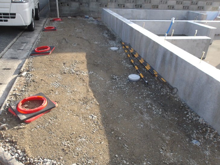 設備配管工事完了後道路に面する敷地部分には砕石を敷き込みました。