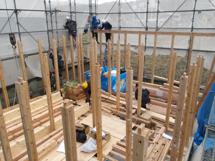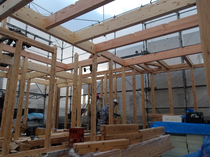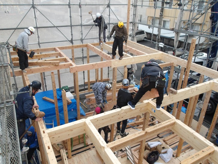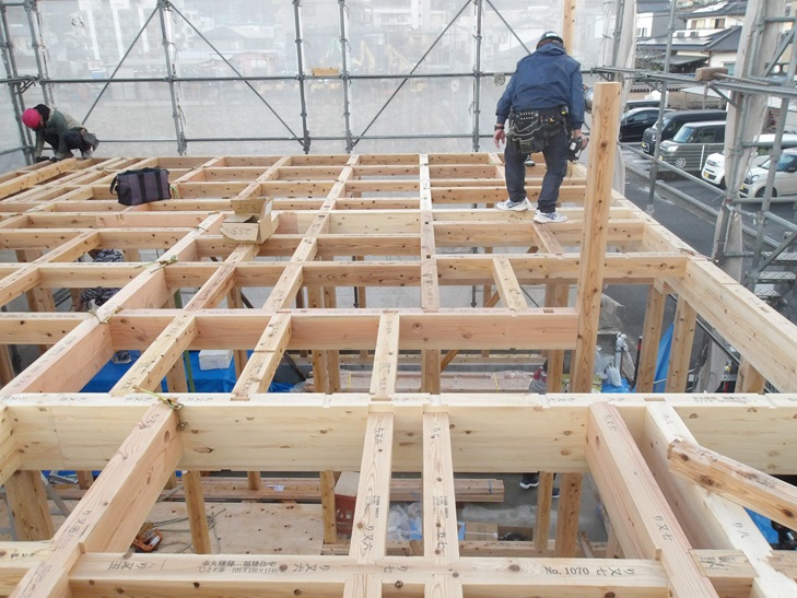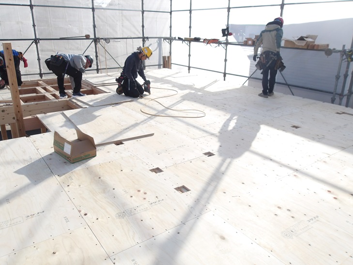 分厚い合板を使用して強い床にして家の剛性、耐震性を高くする剛床工法です。