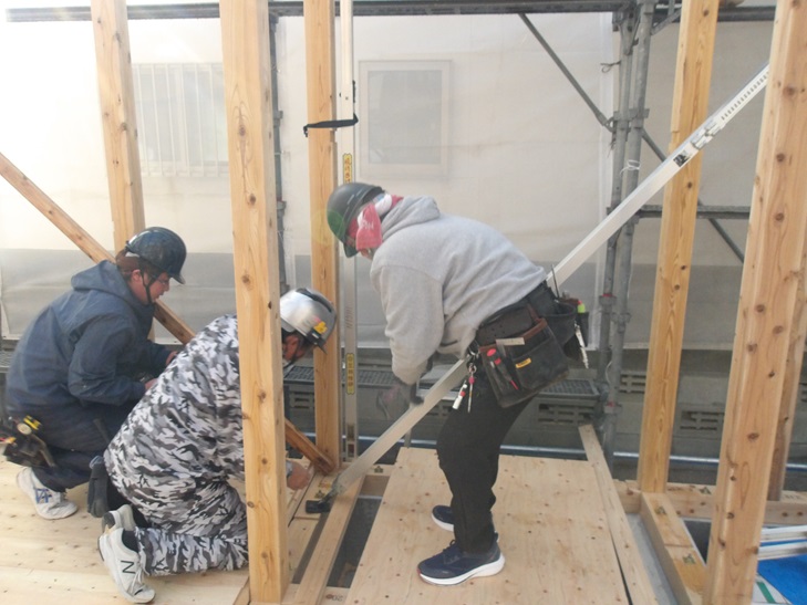 そして、傾きがある柱は垂直にして、柱が傾かないように筋交い(斜めに取り付ける木材)を取り付けます。