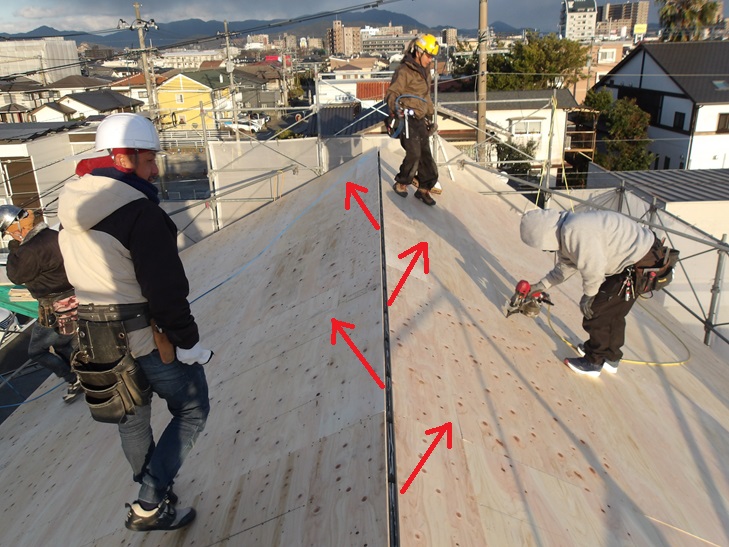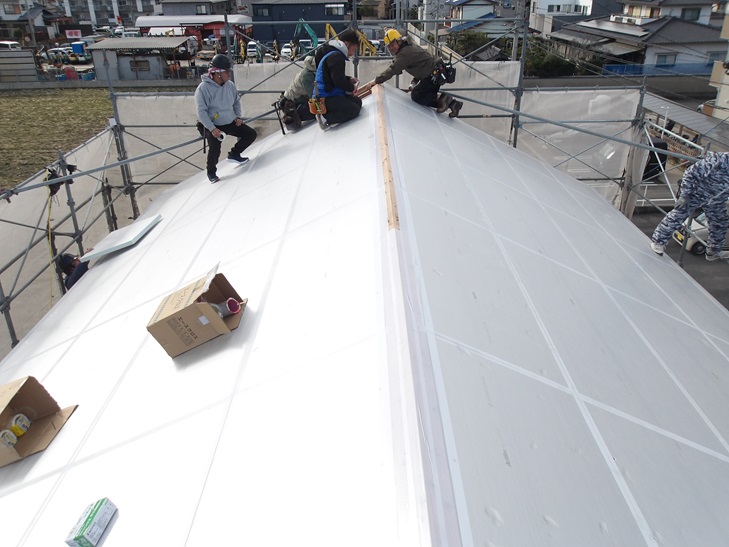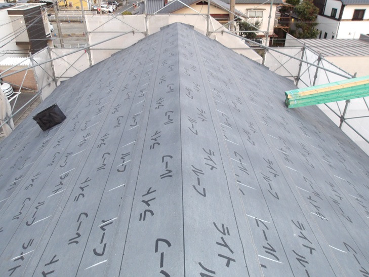 野地板の上に屋根の2次防水である防水ルーフィングを施工します。
