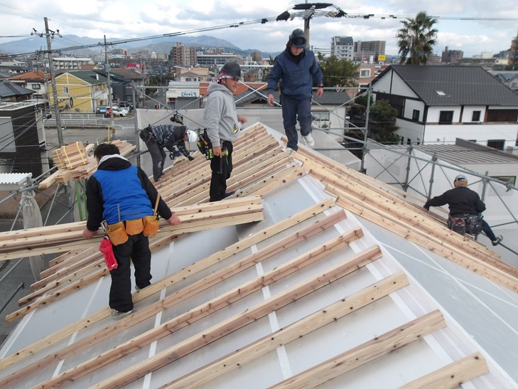 垂木の上に屋根瓦を施工するための野地板を張ります。