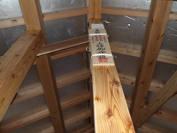 上棟札の上に見える天井は屋根の断熱材が見えています。