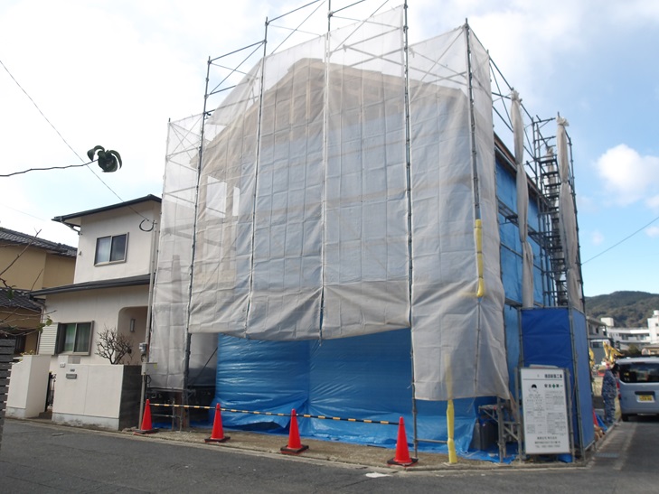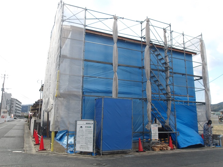 寒さ対策風対策で外側にブルーシートを張って大工工事です。