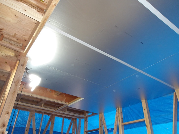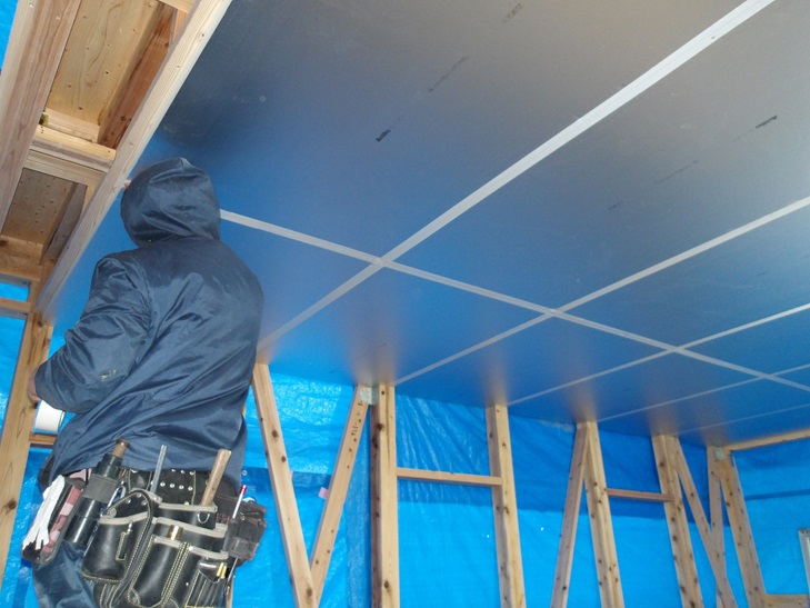大工工事は、ビルトインガレージの天井に板状の断熱材を取り付ける工事です。