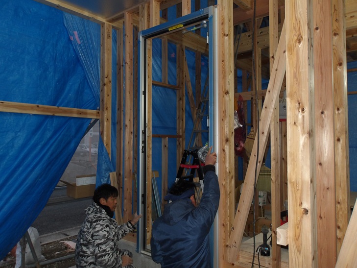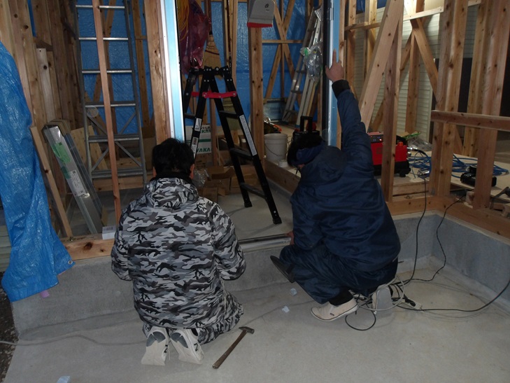 西棟梁と岡田大工さんのお二人でドア枠取りつけます。