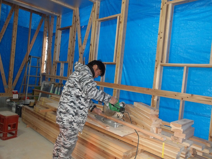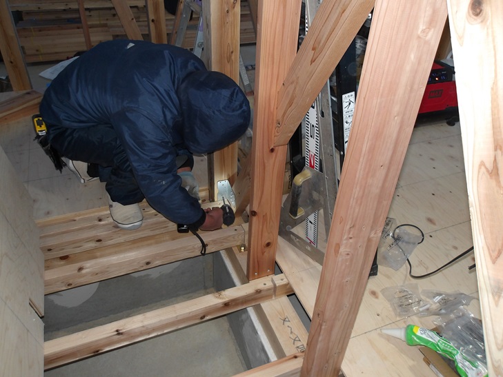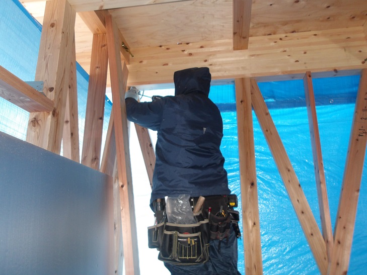 < 写真は筋交いプレートを取りつけている岡田大工さんです。