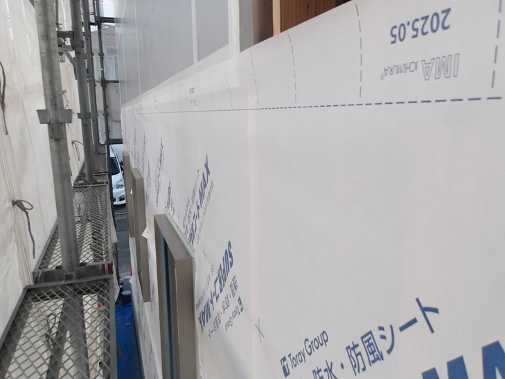 壁には、2次防水のための透湿防水シートを張ります。