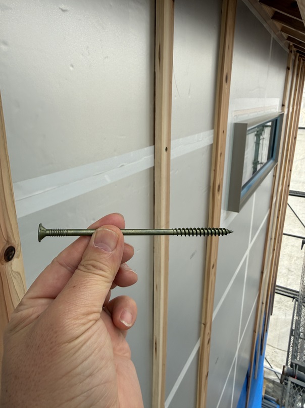 通気胴縁を貫通し断熱材を貫通し家の柱に届き通気胴縁が外壁材を支える力を持てるようにする専用のビスです。