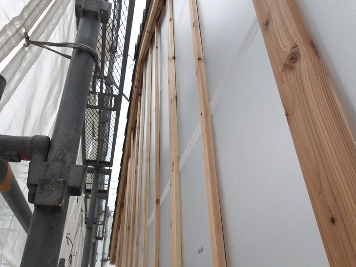 バルコニーの下地工事が終わると引き続き通気胴縁の取り付け工事です。