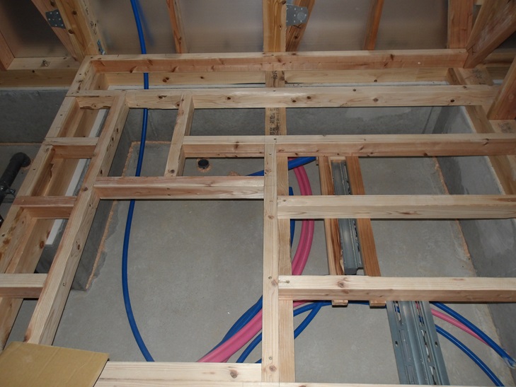床下や壁の中に給水管、排水管を施工します。
