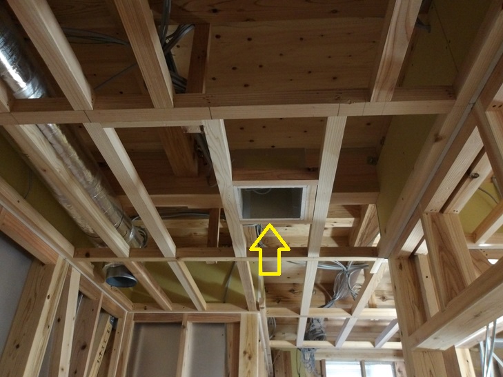 大工工事中にダウンライト部分に石膏ボードで作った防火カバーを取り付けます。