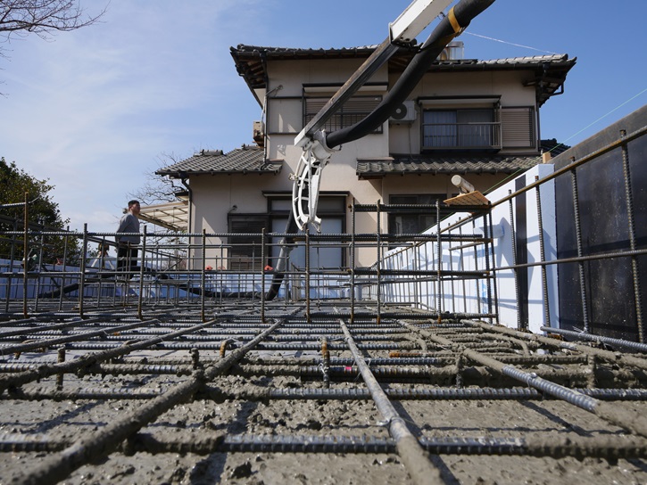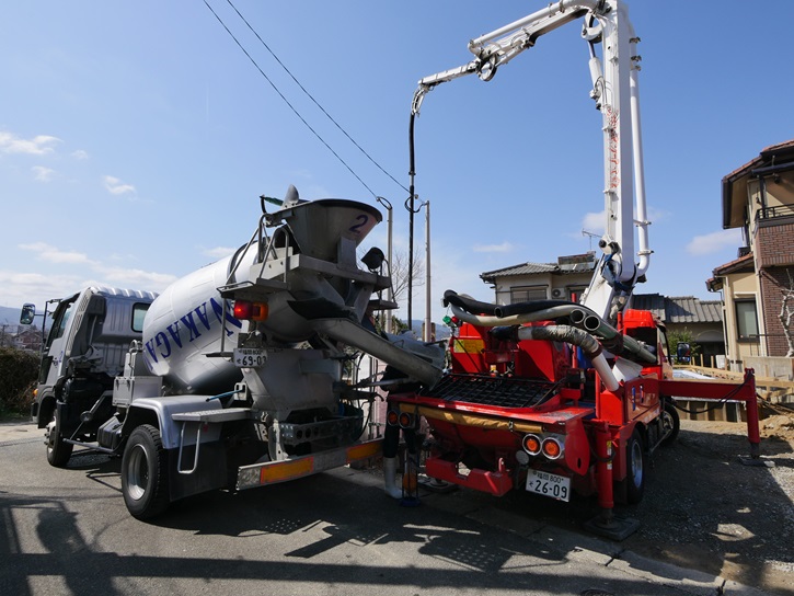 コンクリートミキサー車で運ばれてきたコンクリートをポンプ車を使い基礎内部へ施工します。