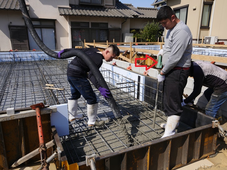 赤矢印のバイブレーターを使いコンクリートを振動させてコンクリートを隅々まで入り込むように施工します。