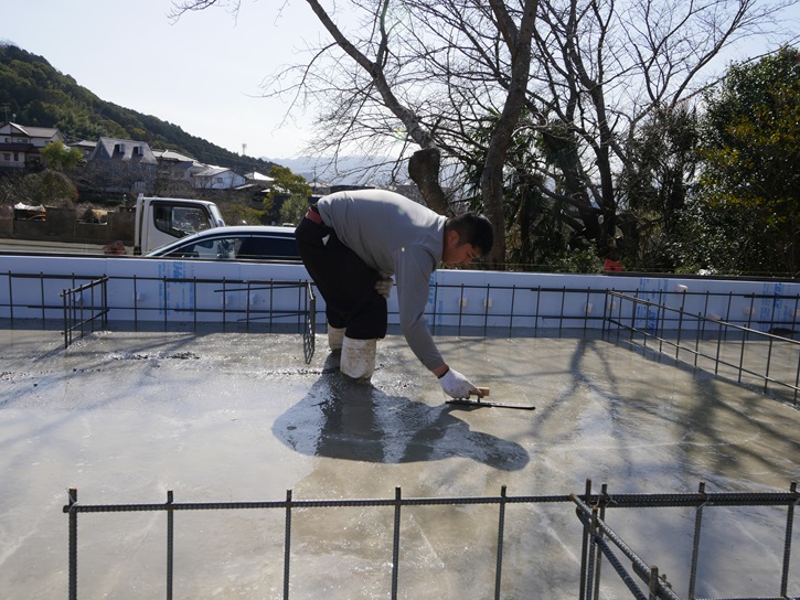 最後の基礎コンクリート全体の表面を金ゴテで綺麗に均します。