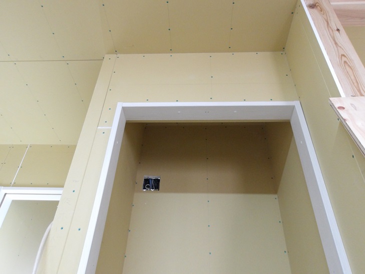 窓枠、ドア枠を取り付けて石膏ボード張りです。