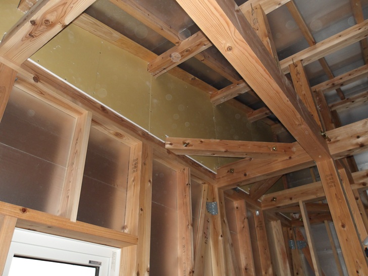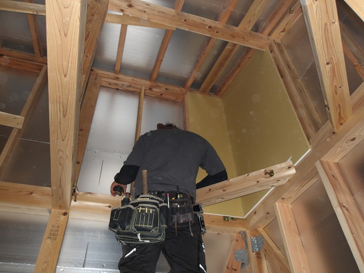 小屋裏部分にファイヤーストップの石膏ボードを施工しています。