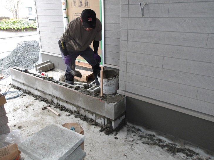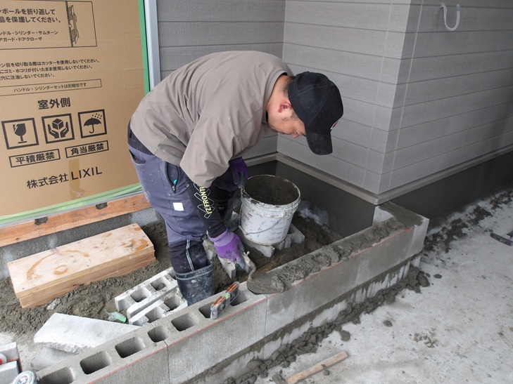 ブロックとモルタルで玄関ステップの下地を作ります。
