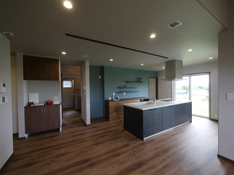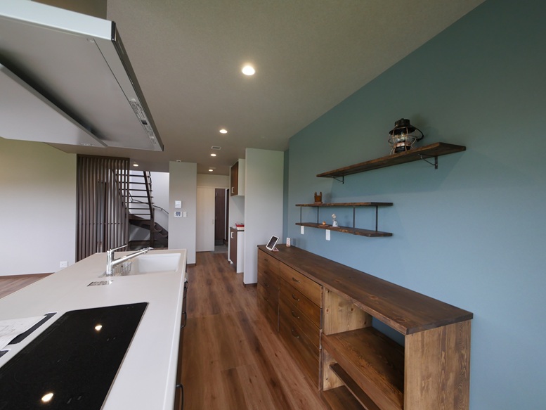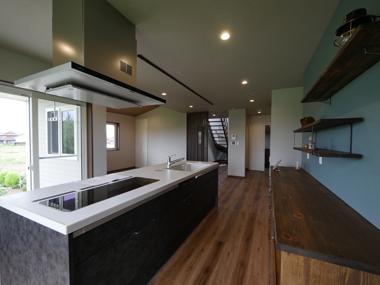 アイランドキッチンと収納棚 飾り棚 施工実例