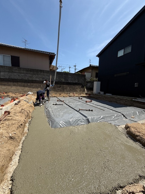 基礎工事は、防蟻防水シート施工後基礎外周部分に捨てコンクリートを打設します。