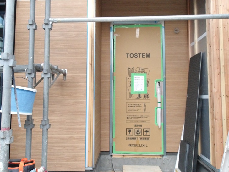 玄関部分はアクセントのサイディングを張っています。