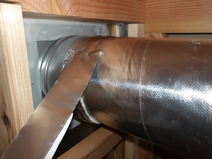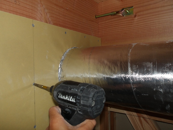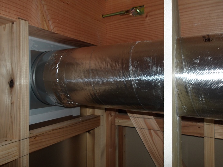 換気扇のダクトを厚さ50mmのグラスウールを被覆してアルミテープで仕上げます。
